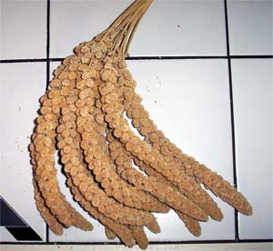 Eine sehr beliebte Leckerei ist die Kolbenhirse. Sie sollte aufgrund des hohen Fettgehalts aber nicht zu oft gereicht werden. Besonders beliebt sind rote und gelbe Kolbenhirse, aber auch anderen Hirsesorten wie Sorghum- oder Rispenhirse sind die Wellensittiche gegenüber nicht abgeneigt. Wenn man die Möglichkeit hat, sollte man auf jeden Fall auch ab und zu (in den Sommermonaten) halbreife Hirsesorten füttern, da diese mehr Vitamine enthalten.